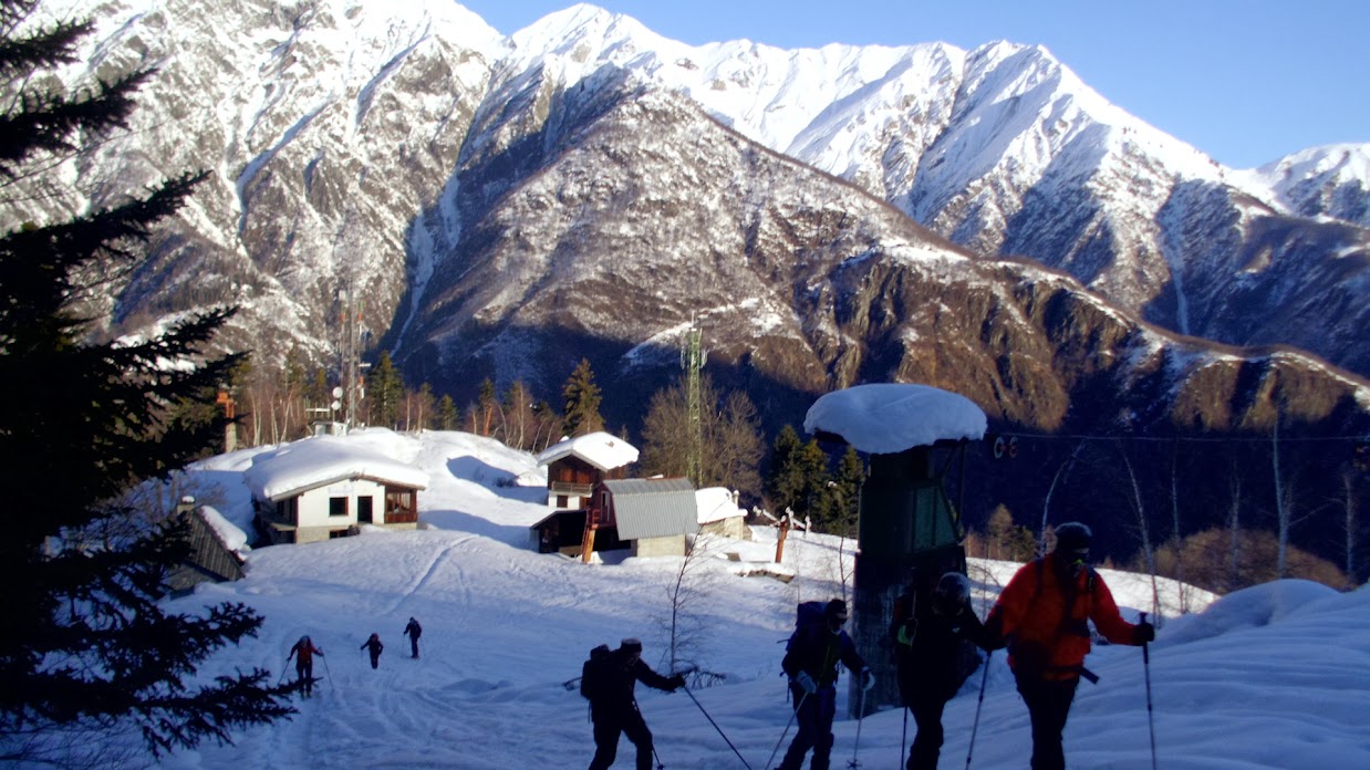 Sempre nello splendido bosco ci si porta gradualmente a sinistra, guadagnando, con salita un po’ più ripida e faticosa per mancanza di traccia, la cresta che, con leggeri saliscendi, conduce in vetta al Pizzetto, quota 1879, dopo 3 ore dalla partenza. Per fortuna uno degli anziani, abituato alla fatica dalla sua attività di maestro e accompagnatore, si fa carico quasi da solo della battitura di pista. Panorama mozzafiato, tanta neve, tante foto. Sembra di essere in un altro mondo, a due passi dal paradiso, anche se la quota è modesta e le nebbie della pianura sono a pochi chilometri da noi. Di ritorno a Villa Samonini ci concediamo una lunga pausa pranzo, sistemati in qualche modo sulla neve, che sommerge quasi completamente le baite più basse. In discesa troviamo neve di ogni tipo, a seconda del tipo di pendio, dell’esposizione, della quota: gelata, crostosa, molle, ecc …
