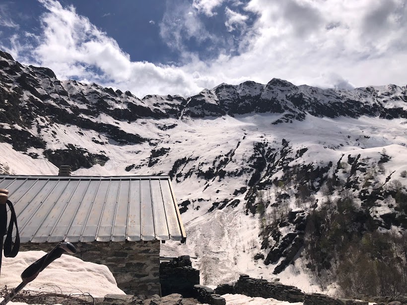 Una grossa valanga fra noi e l’Alpe Drosone Dentro smorza fortunatamente le velleità degli amici e ci fermiamo a pranzare e contemplare al sole, ma non al vento, festeggiando con torta e altre leccornie delle nostre badanti pasticcere il compleanno di una di loro. Durante la discesa ci offre un graditissimo caffè nella sua bellissima baita a La Tagliata una di quelle persone che ti fanno apprezzare ancor di più le bellezze della montagna e della magica atmosfera che la circonda.