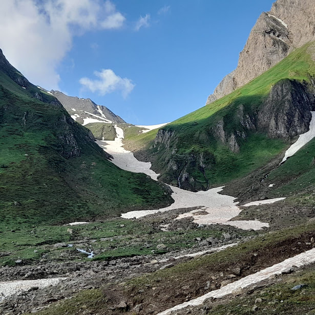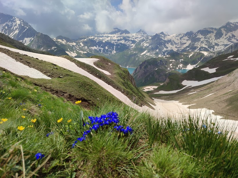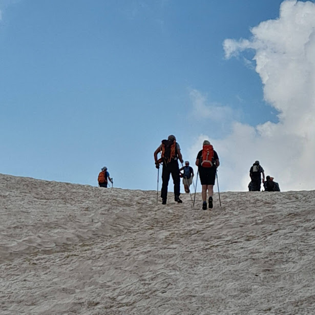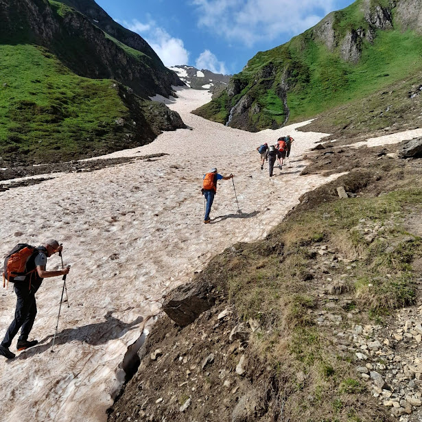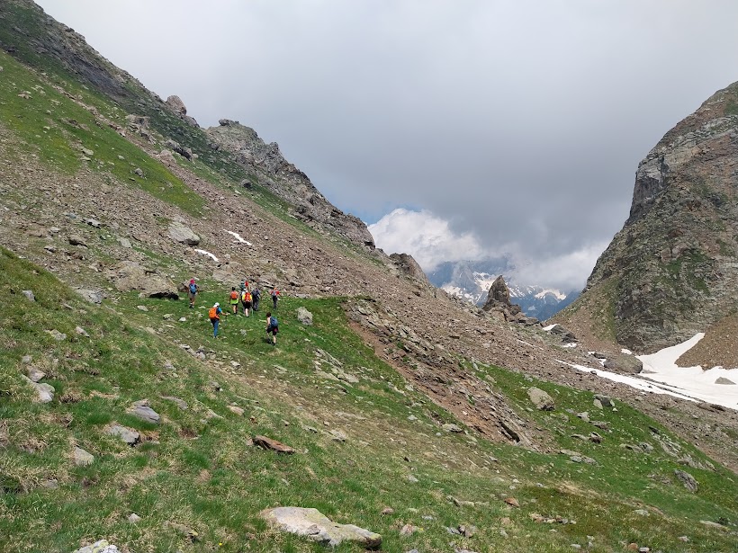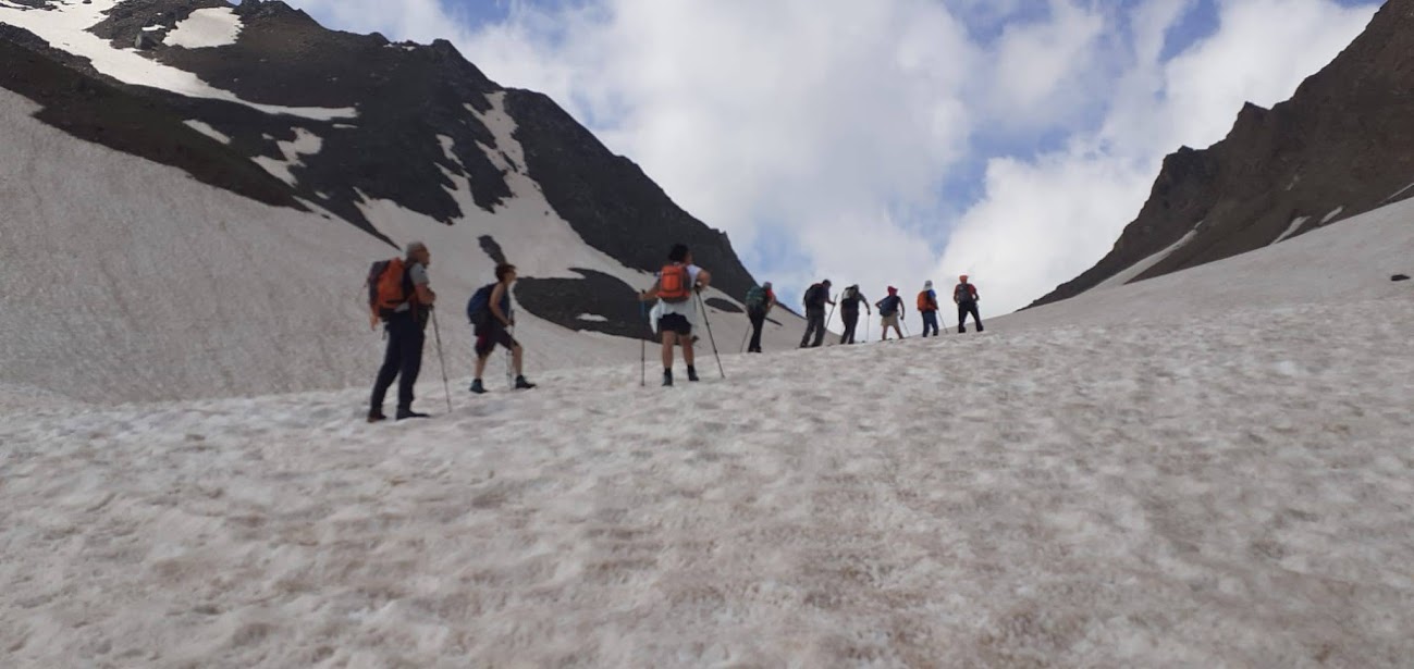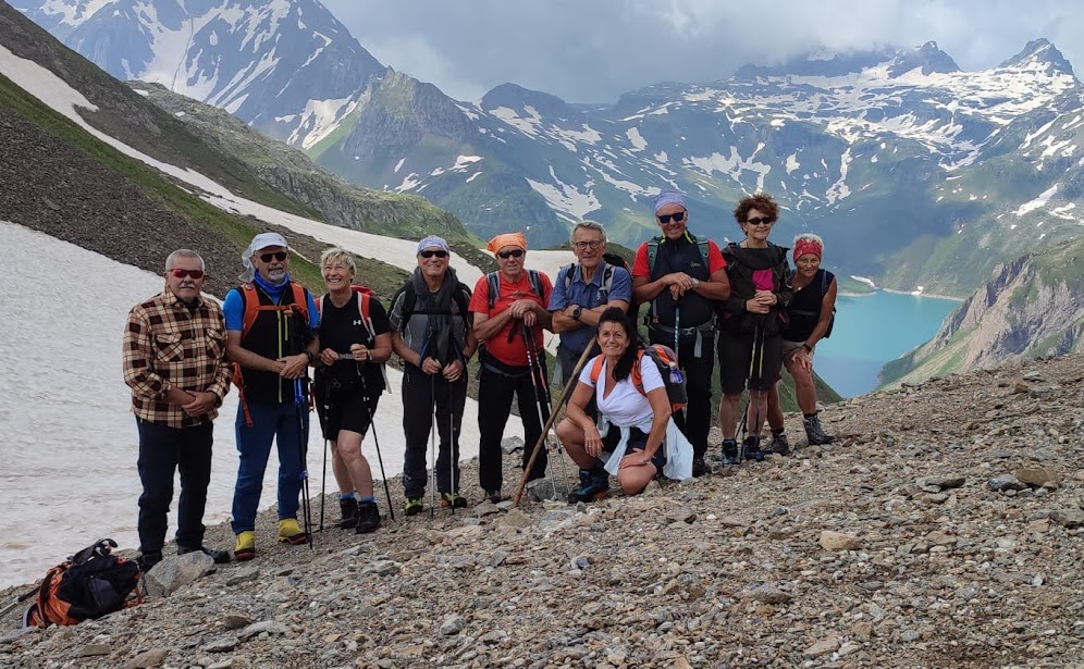 FORMAZZA- 11-07-2024-- Questa bellissima escursione ad anello “aperto” ce l’eravamo già gustata altre volte, ma oggi, senza averla programmata, la percorriamo per la prima volta in senso antiorario, onorati di essere guidati dal nostro presidente walser. C’è ancora tanta neve che ci rende più gradevoli sia la salita al Passo di Nefelgiù, sia la discesa dalla Bocchetta del Gallo.