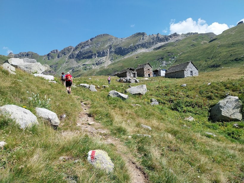 Subito oltre il laghetto teniamo la destra e saliamo alla Bocchetta di Scarpia, 2248 (due ore e un quarto da Corte Verde). Scendiamo adesso verso la valle di Agaro e Poiala e, a quota 2200, con primi scorci sul Lago di Agaro, ci fermiamo a rifocillarci, rapidamente per recuperare il tempo perso al mattino. Proseguiamo per l’Alpe Poiala, 2148, uno dei nove alpeggi di produzione del formaggio Bettelmatt.