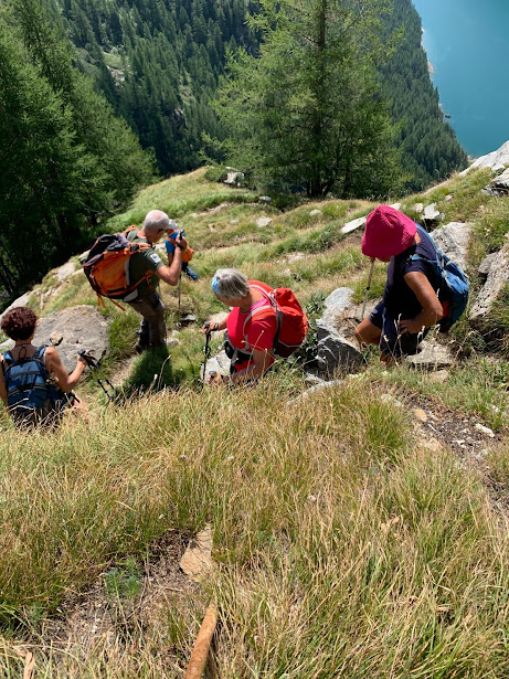 Un altro giovedì in Paradiso, nonostante i nostri peccati. A Corte Verde una freccia rossa su un sasso e la scritta “Nava” ci ingannano. Teniamo la destra seguendo un sentierino che, più in alto, si perde in uno splendido e ripido bosco di larici. Dopo rapide consultazioni prevale la saggezza della nostra età media elevata (escluse naturalmente le badanti) e torniamo a Corte Verde. Abbiamo perso quasi un’ora, ma in questa meravigliosa giornata va bene anche un approfondimento delle nostre conoscenze di un territorio nuovo e di grande bellezza.