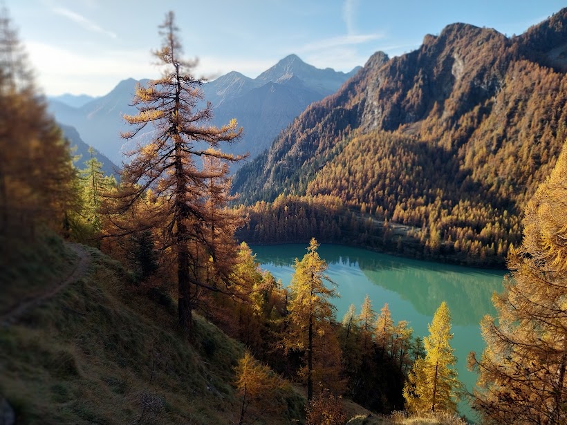 Lungo il bellissimo sentiero C27a, che fa parte dell’ennesimo SG (Sentiero Geologico), scendiamo ad incrociare il sentiero più frequentato della zona, che è quello che collega Cheggio all’alta Valle Loranco e al Passo delle Coronette (C27). Diretti verso il lago passiamo dall’Alpe del Gabbio, attraversiamo il torrente Loranco, ricco di acqua, costeggiamo la sponda meridionale e oltrepassiamo la diga fino alle auto (un’ora e un quarto). Il giro del lago in senso antiorario è completato.