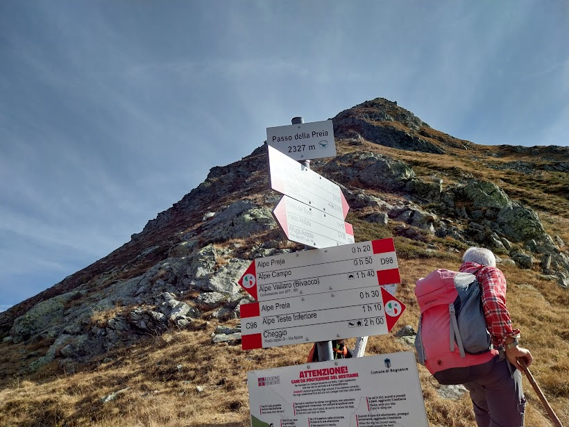 Si passa dall’Alpe Teste di Mezzo e si arriva al bivio per l’Alpe di Teste, 2001, che visiteremo al ritorno. Guadiamo il Riale Buscègn ed arriviamo all’Alpe Preia, 2083, che si trova in una bellissima posizione (un’ora). Secondo i cartelli qui è “Preia” mentre in Bognanco, poco sotto il passo omonimo, è “Preja”. Con passo tranquillo, dettato dal mio incedere da “vaca vègia”, lungo il sentiero C98 arriviamo al Passo della Preia, 2327, che era la meta programmata.