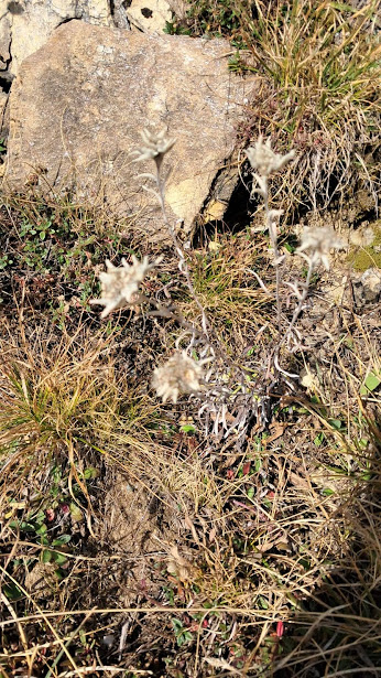 Notiamo, vicina al sole, una nuvoletta con i colori dell’arcobaleno. Che sia una piccola aurora boreale? Ripassiamo dal Passo della Preia e più sotto fotografiamo, e basta!, delle splendide stelle alpine che ci confermano che qui, fortunatamente, il transito dell’homo sapiens non è frequente. Passiamo dall’Alpe ed andiamo a gustarci l’ennesimo panorama, grazie ad una breve deviazione dal sentiero, all’Alpe di Teste, diroccata e devastata dai cinghiali. Torniamo sul sentiero principale e scendiamo all’Alpe Teste Inferiore (un’ora e un quarto da Passo Castello).