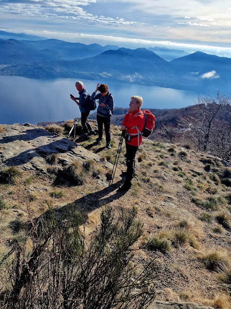 Prima del bivio per l’Alpe Morissolo ci fermiamo per una parca colazione, in previsione delle libagioni che ci attendono. Qui sale, non indicata, una traccia sulla sinistra, in mezzo alla vegetazione fortunatamente quasi invernale, su quella che sarebbe una bellissima mulattiera della Linea Cadorna. Un altro Paradiso perduto nel nostro territorio, ahimè! Sui cartelli indicatori qui si risparmia decisamente. Qualche tornante in mezzo alle felci ingiallite e, sulla dorsale, invertiamo decisamente la rotta verso ovest e poi sud. In dolce salita, pestando gli ultimi residui di neve, arriviamo in vetta al Monte Morissolino, 1410, dopo un’ora e tre quarti dal campo base di Calpera.