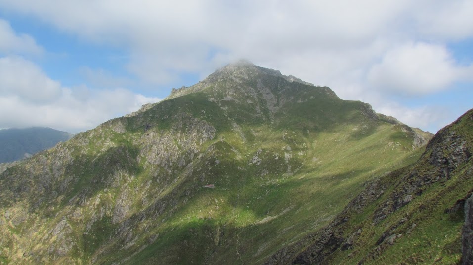 Da grande alpinista parte in quarta, pensando sia un passo tranquillo anche per noi, cosicché dopo un quarto d'ora gli ricordiamo che il nostro è il gruppo dei “Trotapian”, chiediamo pietà e inseriamo le ridotte. Non percorriamo l'itinerario normale e più diretto, ma seguiamo la guida che vuole farci vedere il più possibile delle sue montagne. Il sentiero G4 ci porta alla Bocchetta di Gemevola, dove imbocchiamo il G7 scollinando leggermente e, lungo un sentiero “serio”, con qualche catena che aiuta, risaliamo alla Sella della Scaffa,1512.