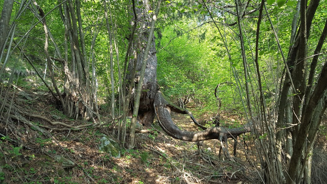 Lungo il torrentello che lo alimenta ci rifocilliamo in allegria, riempiendo dei consueti elogi l’anziano del gruppo, che da mesi non riuscivamo ad infamare. Come ormai da anni, anche oggi è in convalescenza. Non si sarebbe detto salendo. Il periplo del lago è la nostra passeggiata digestiva, seguita dalla discesa diretta all’alpe, raggiunta anche da bici elettriche e fuori-strada. Sempre tranquilli, lungo la pista, torniamo all’Alpe Fuori ed imbocchiamo il ripido sentiero del mattino, ormai nel bosco. Uno dei tanti incroci con la strada ci riesce fatale. Non vedendo il segno evidente pochi metri più in basso, imbocchiamo una traccia che più sotto si perde. Ci abbassiamo di oltre cento metri alla ricerca del sentiero senza risultati. Chi riconosce l’errore risale fino alla strada e ritrova il sentiero giusto.